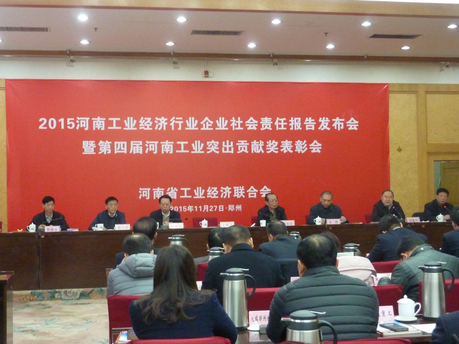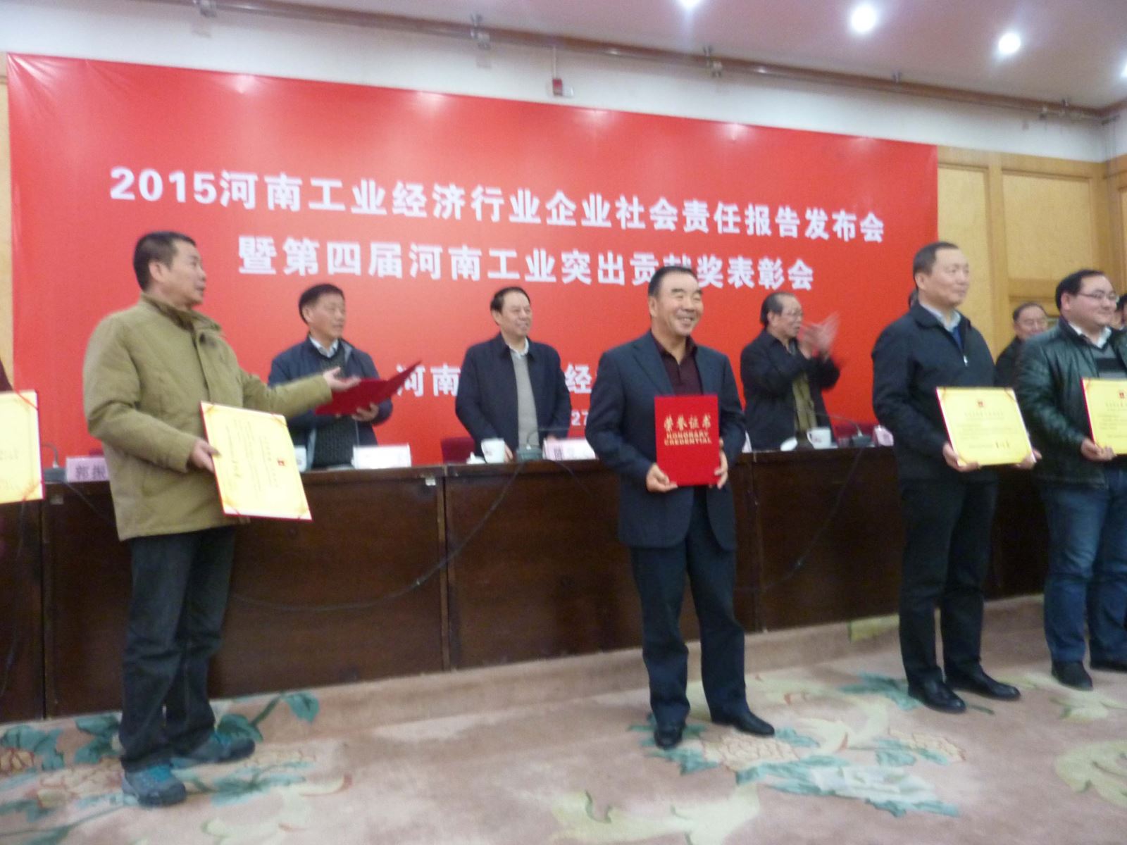 11月27日上午,2015河南工業(yè)經(jīng)濟(jì)行業(yè)社會責(zé)任報(bào)告發(fā)布會暨第四屆河南工業(yè)突出貢獻(xiàn)獎表彰會在省人民大會堂召開。會議發(fā)布了行業(yè)企業(yè)社會責(zé)任報(bào)告,表彰了第四屆河南工業(yè)突出貢獻(xiàn)企業(yè)和企業(yè)家,展示了行業(yè)協(xié)會調(diào)研成果。省委、省人大、省政府、省政協(xié)有關(guān)部門領(lǐng)導(dǎo)及省發(fā)改委、工信委、民政廳、國資委、省政府發(fā)展研究中心等有關(guān)政府部門領(lǐng)導(dǎo)及省社科院領(lǐng)導(dǎo)出席會議,河南省工業(yè)經(jīng)濟(jì)聯(lián)合會會長王明義出席會議并講話。 豫聯(lián)集團(tuán)榮獲“第四屆河南工業(yè)突出貢獻(xiàn)獎”,張洪恩董事長榮獲“第四屆河南工業(yè)突出貢獻(xiàn)企業(yè)家”榮譽(yù)稱號。張洪恩董事長受邀出席會議并發(fā)布豫聯(lián)集團(tuán)社會責(zé)任報(bào)告。