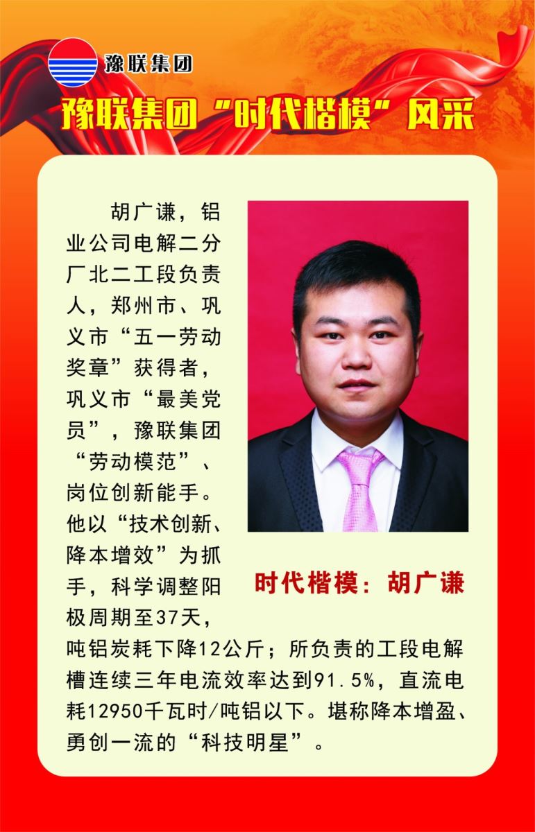 他,是鄭州市、鞏義市“五一勞動(dòng)獎(jiǎng)?wù)?rdquo;獲得者,他,是鞏義市最美黨員,豫聯(lián)集團(tuán)“時(shí)代楷模”、青年崗位能手......他,開(kāi)發(fā)了“3N”鋁特區(qū)、研發(fā)了攻克低鐵槽的技術(shù)......他,叫胡廣謙,中孚鋁業(yè)公司電解二分廠北二工段負(fù)責(zé)人,2006年進(jìn)入公司工作,扎根電解生產(chǎn)一線,勤學(xué)苦練,潛心鉆研,降本增效,勇創(chuàng)一流。