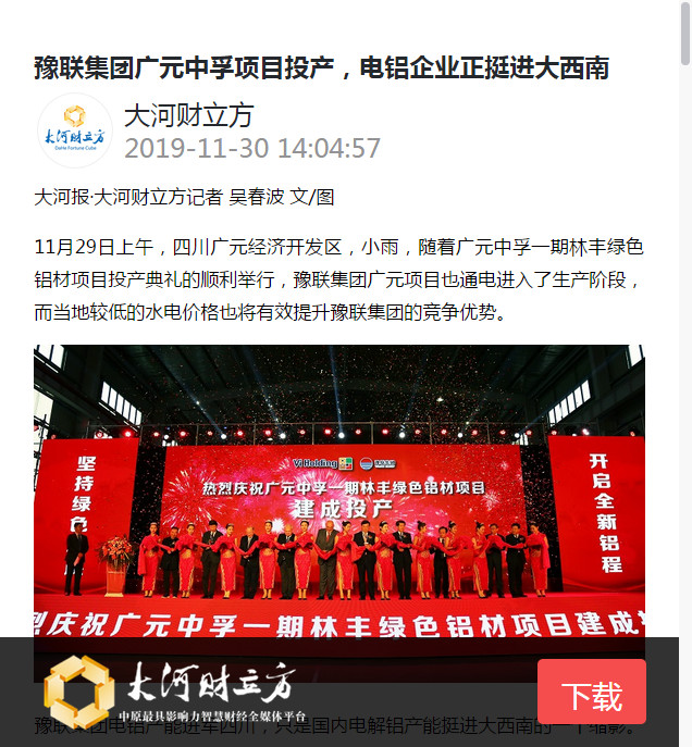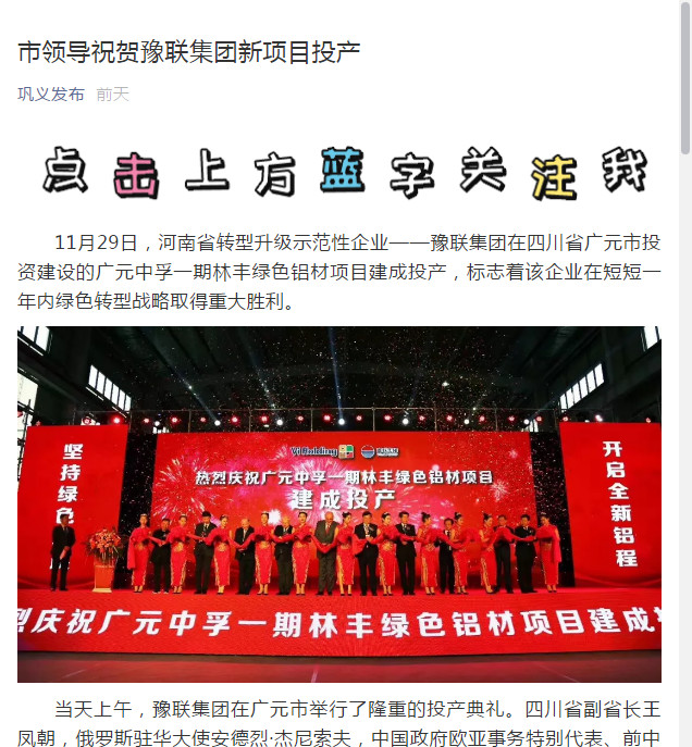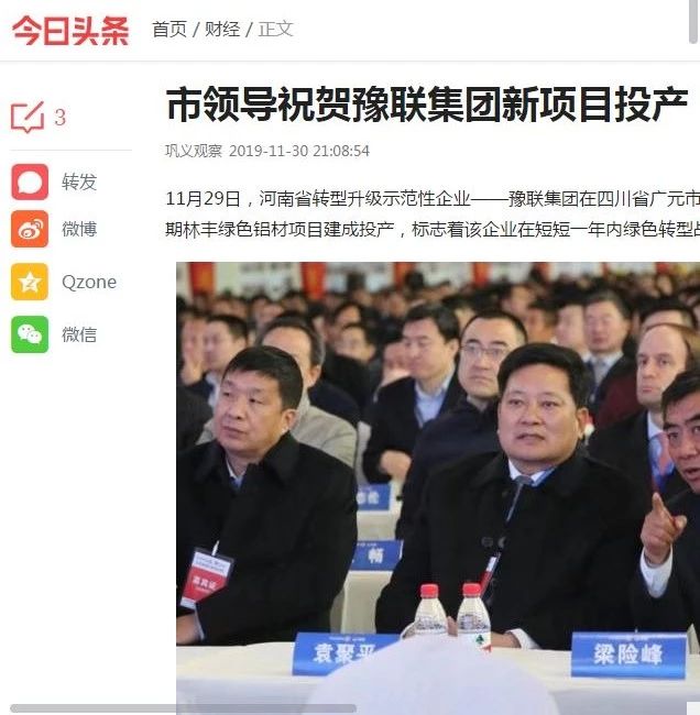 連日來,豫聯(lián)集團廣元中孚一期林豐綠色鋁材項目建成投產的消息被中華人民共和國中央人民政府網、新華社、新華網、人民網、中國證券網、中國有色金屬報、河南日報、鞏義市人民政府網等眾多主流媒體廣泛宣傳、轉載報道。