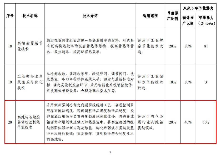 12月10日,工業(yè)和信息化部公布了《國家工業(yè)節(jié)能技術(shù)裝備推薦目錄(2019)》。由中孚實(shí)業(yè)研發(fā)的“高純鋁連續(xù)旋轉(zhuǎn)偏析法提純節(jié)能技術(shù)”入選該目錄,這也是鋁行業(yè)唯一入選的節(jié)能技術(shù)。