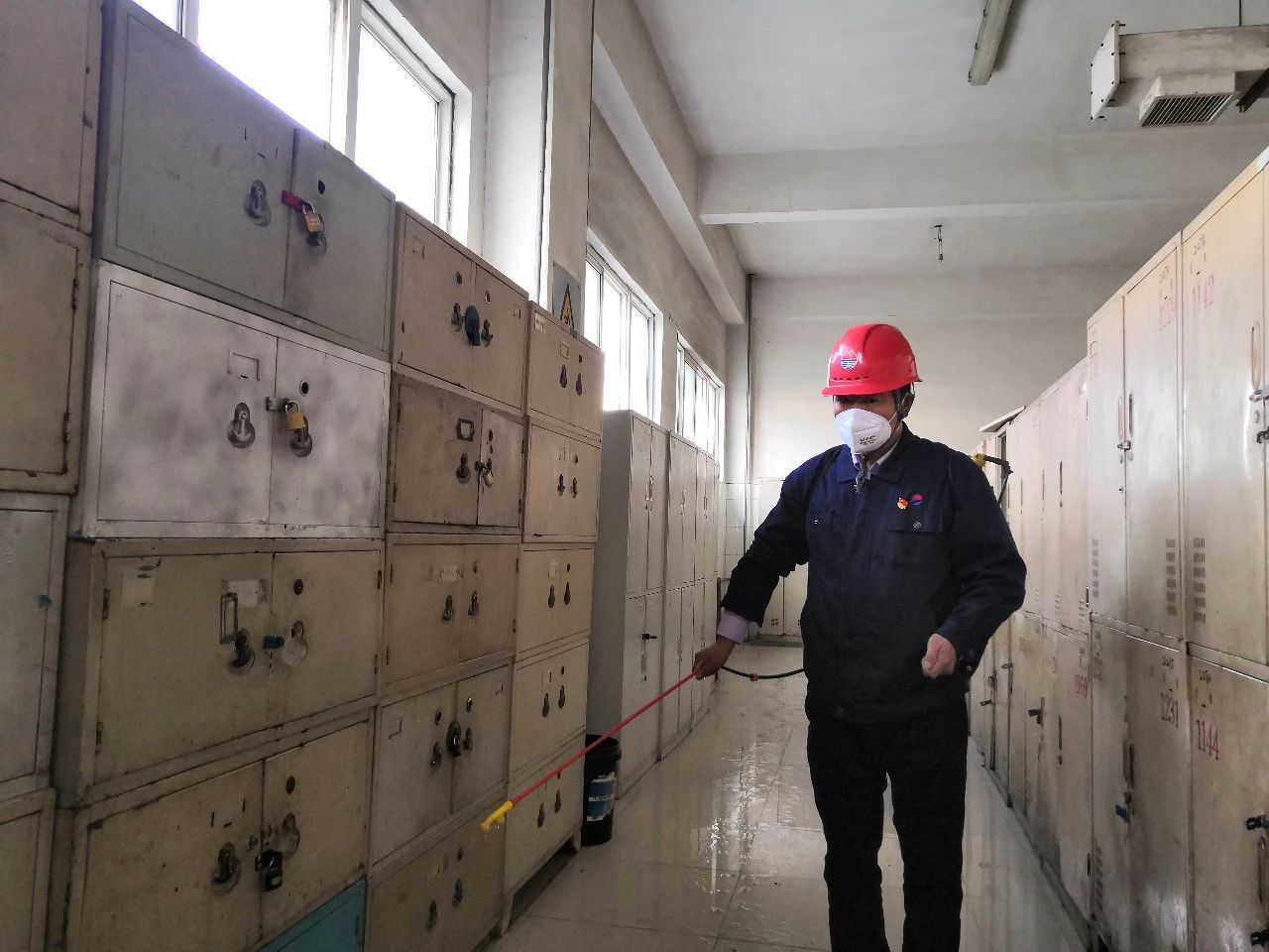 劉現(xiàn)鋒對員工澡堂更衣室進行消毒