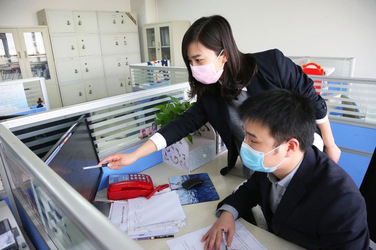 圖為呂玲玲對(duì)翟純金進(jìn)行業(yè)務(wù)指導(dǎo)